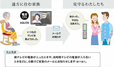 例えば、ひとり暮らしのお年寄りがテレビの電源を入れると、離れて住む家族にメールで自動通知したり、逆に、24時間テレビの電源が入らなかったときにもお知らせメールを送信するなど、離れて暮らす家族をサポートします。